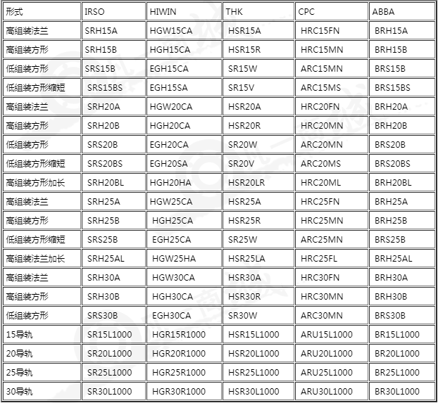 飛梭IRSO與其他品牌直線導軌型號兌換表: