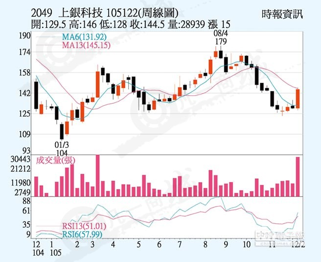 上周,在外資持續(xù)買超帶動(dòng)下,上銀科技終場(chǎng)股價(jià)上漲3.5元、收144.5元,一舉突破周線、月線及季線反壓套牢區(qū),股價(jià)周漲幅11.58%。