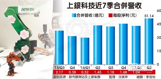 上銀三大主力商品滾珠絲桿、直線導(dǎo)軌及機器人,因全球力推工業(yè)4.0,對智慧自動化設(shè)備需求殷切,智慧自動化需要用到滾珠絲桿及直線導(dǎo)軌等關(guān)鍵零組件,加上全球景氣逐步回升,尤其今年大陸、歐洲及日本等地市場需求持續(xù)成長,帶旺6月合并營收攀升至17.71億元,年增加14.55%,續(xù)創(chuàng)單月營收新高;第2季合并營收51.14億元,年增18.15%,創(chuàng)單季營收高;上半年合并營收高達94.02億,也創(chuàng)同期新高,表現(xiàn)優(yōu)于市場預(yù)期。