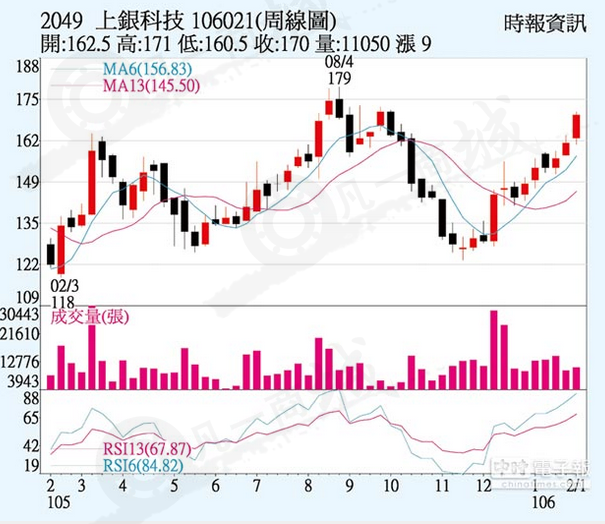 上銀大廠(2049)因滾珠螺桿、直線導(dǎo)軌及機(jī)器人三大主力產(chǎn)品,17年首季訂單因大陸對(duì)智慧自動(dòng)化設(shè)備及機(jī)器人需求增溫而滿載,開始接第2季訂單,今年合并營(yíng)收要挑戰(zhàn)200億元目標(biāo),上周五三大法人聯(lián)手買超1,599張,股價(jià)上漲7.5元、收170元,周漲幅5.59%。