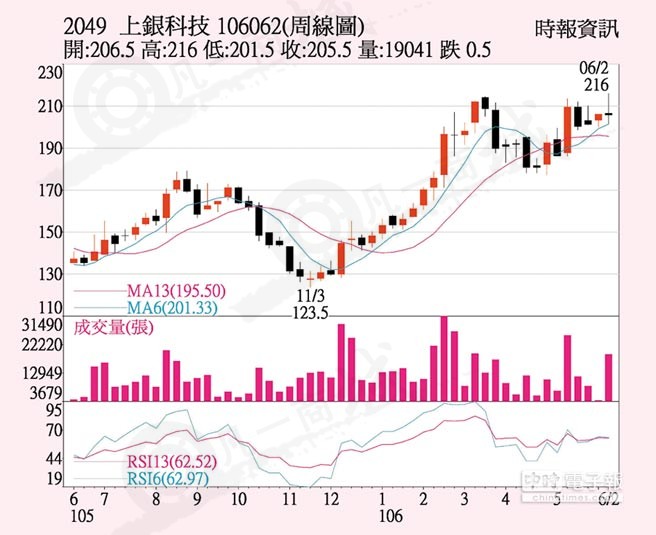 上銀(2049)5月合并營收攀單月新高,前5月合并營收改寫同期新高,法人預期6月營收有挑戰17億元實力,第2季營收上看50億元,季增16%,上周五股價以高盤開出,但遭外資及投信賣盤摜壓,靠著自營商及市場買盤承接,終場上漲1.5元、收205.5元。