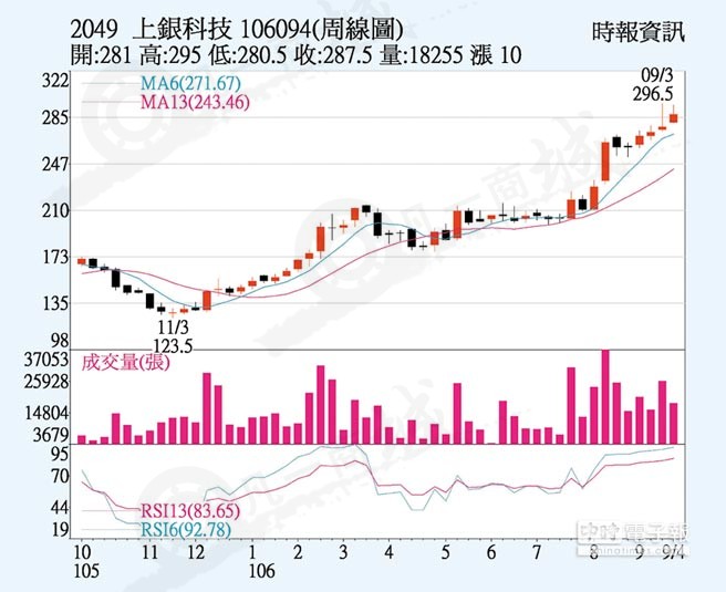 上銀科技(hiwin)受惠直線導(dǎo)軌及滾珠螺桿等關(guān)鍵零組件訂單滿手至明年底,加上德國漢諾威展接單增3~5成等利多題材,外資等法人連續(xù)買超,近三個月股價大漲近4成后,出現(xiàn)整理格局,上周五下跌5元收在287.5元,法人估在原料缺貨追單題材下,行情仍有望追高。