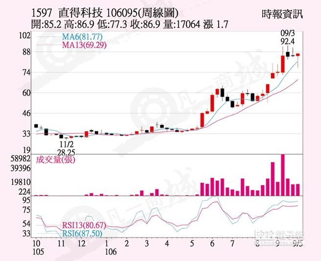 直得科技(cpc)生產(chǎn)微型直線導(dǎo)軌為主,因智能型手機及半導(dǎo)體設(shè)備商需求殷切,前7月EPS攀升至1.59元,法人預(yù)期全年EPS具有挑戰(zhàn)2元以上實力,上周六成交爆大量,推升股價至漲停86.9元收盤,上漲7.9元,突破5日、月線及季線反壓套牢區(qū),上周漲幅2.0%。